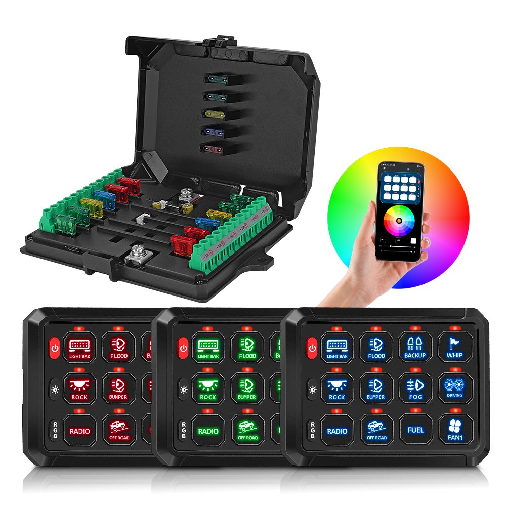 12 Gang Switch Panel with RGB Backlit andBluetooth control for 12V/24V Vehicles