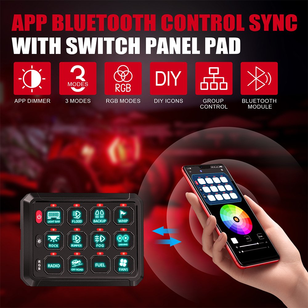 12 Gang Switch Panel with RGB Backlit and Bluetooth Control for 12V/24V Vehicles