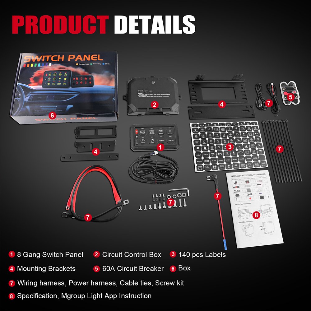 The SAM-BSP08 is an advanced 8 gang switch panel designed for 12V and 24V vehicle electrical systems, offering a stable 60A total load capacity with full APP control through a dedicated mobile application. Its RGB backlit interface provides excellent visibility and personalization for various lighting environments, while the clean wiring architecture ensures efficient installation and reliable long-term performance. Ideal for controlling off-road lights, pumps, compressors, in-car accessories and marine electrical equipment, this panel supports both standard use cases and customized configurations through Nuobei’s optional upgrade services.